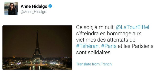 به گزارش جماران ، آن هیدالگو شهردار پاریس در توییتر اعلام کرد که چراغهای برج ایفل امشب به احترام جانباختگان حوادث تروریستی تهران خاموش می شوند.