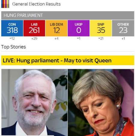 براساس نتایج یاد شده، حزب محافظه کار به رهبری 'ترزا می' همچنان بزرگترین حزب انگلیس در مجلس عوام باقی ماند اما اکثریت در پارلمان را از دست داد.