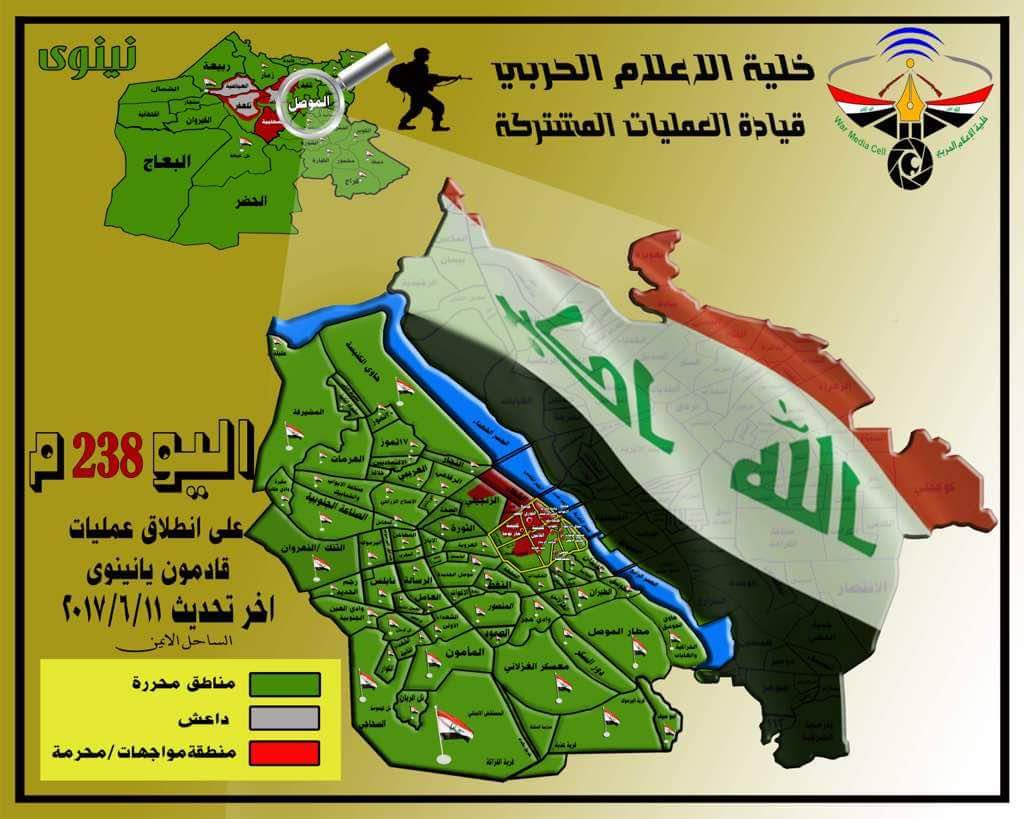 وزارت دفاع عراق در بیانیهای اعلام کرد: بخش اطلاعاتی عملیات آزادسازی نینوا زیرمجموعه اداره اطلاعات نظامی با بهرهگیری از دادههای دقیق، ساختمانی با نام الخضراء در نزدیکی محله الکرامه از سمت چپ موصل را هدف قرار دادند.