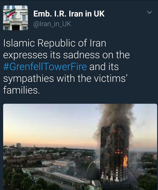 به گزارش جماران، صفحه توییتر سفارت کشورمان در لندن نوشت که جمهوری اسلامی ایران با خانواده های قربانیان آتش سوزی برج گرانفل همدردی میکند.