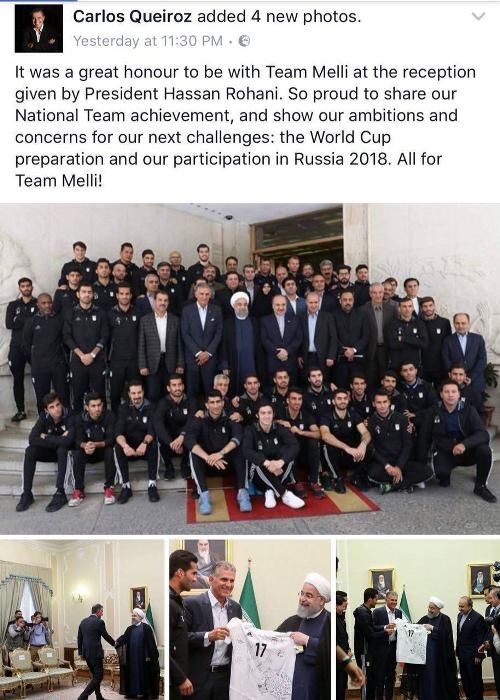 کارلوس کیروش در صفحه فیسبوک خود مطلبی درباره دیدار با حسن روحانی نوشت.