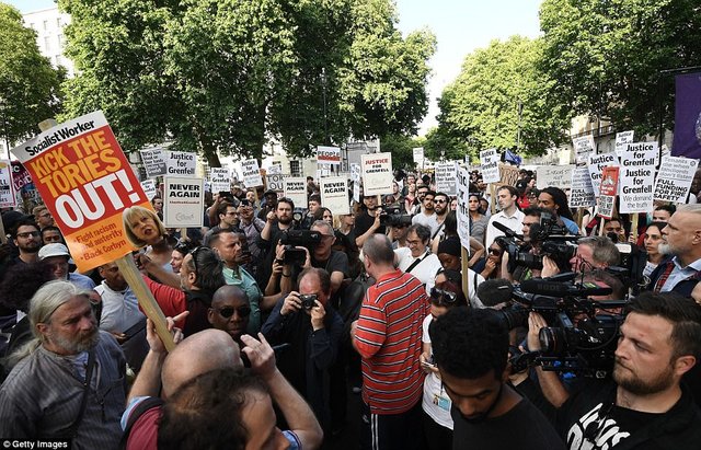جمعیت در حالی در داخل و برابر ساختمان شهرداری ادامه یافت که همزمان ترزا می، نخست وزیر مشغول بازدید از بازماندگان و رسیدگی به نحوه امدادرسانی و اسکان آنها بود.