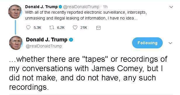 به گزارش جماران، رئیس جمهوری آمریکا در پیام توئیتری گفت مکالمه خود با رئیس پیشین اف بی آی را که پیرامون دخالت روسیه در انتخابات سال 2016 آمریکا بوده ضبط نکرده و به چنین نواری دسترسی ندارد