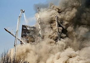 ۳- در ساعت ۱۱:۰۲ با ریزش بخش شمالی ساختمان، افراد محبوس شده به همراه دیگر آتشنشانان به پایین سقوط میکند.