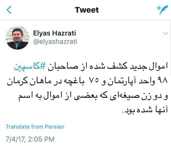 به گزارش جماران، حضرتی در توییتر خود نوشت: اموال جدید کشف شده از صاحبان کاسپین ۹۸ آپارتمان و ۷۵ باغچه و دو زن صیغهای که برخی از اموال به اسم آنها شده بود.