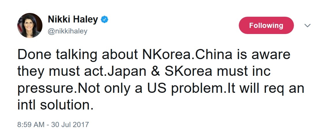 نیکی هیلی سفیر ایالات متحده آمریکا در سازمان ملل در تازه ترین پست توئیتری خود خواستار همکاری کشورهای آسیایی برای حل بحران کره شمالی شد