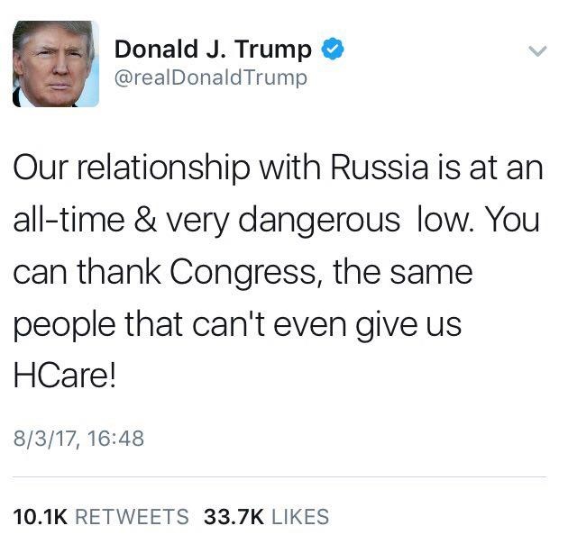 روابط با روسیه بطور بیسابقه و خطرناکی پایین است.شما باید از کنگره تشکر کنید؛ همان کسانی که اوباما کر را ملغی نکردند!