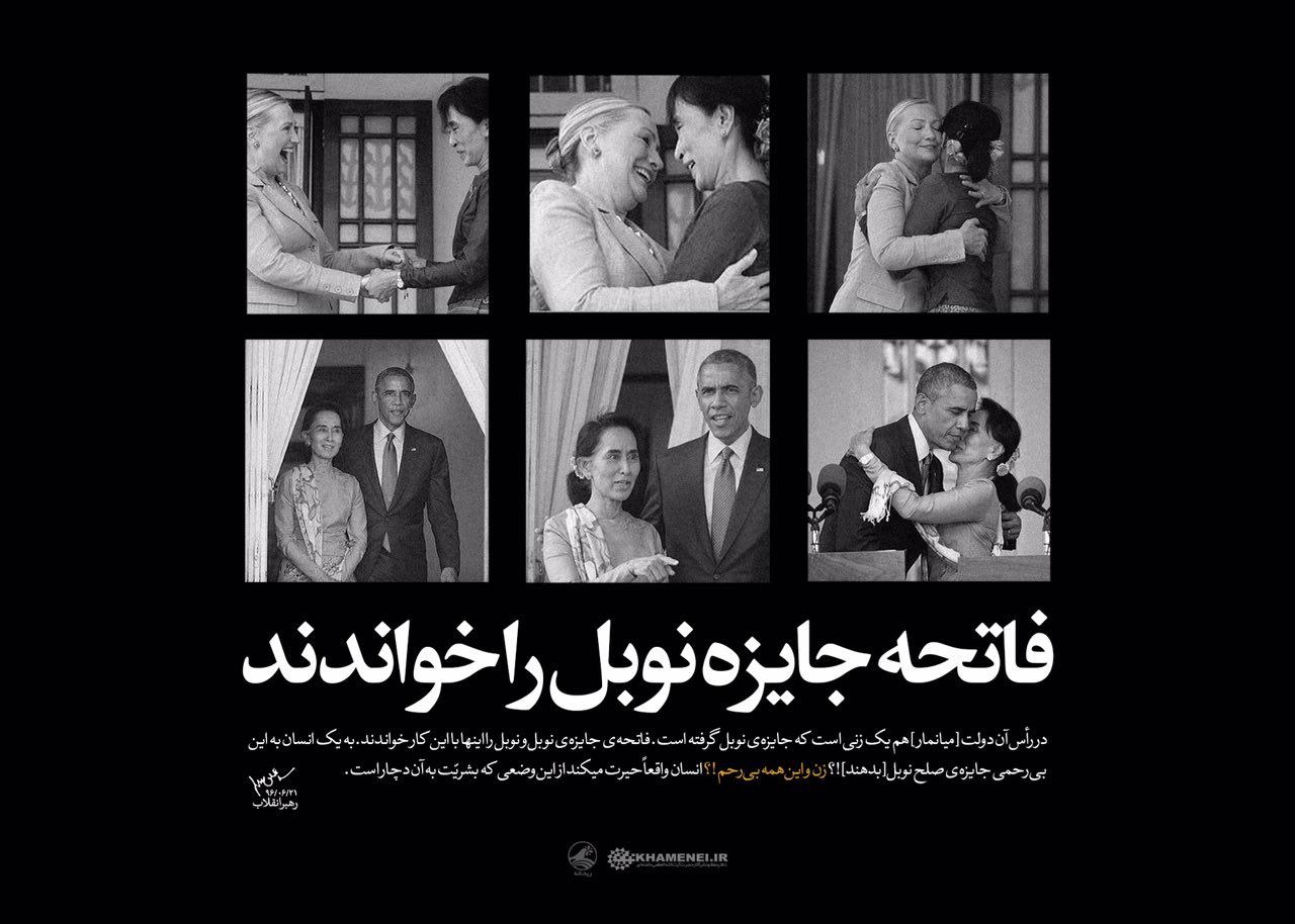 کانال تلگرامی KHAMENEI.IR در پی اظهارات رهبری در خصوص فاجعه میانمار و سکوت آنگ سان سوچی تصویری از سوچی به همراه اوباما و کلینتون و چند جمله از انتقاد رهبری در این باره منتش کرد.