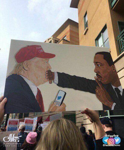 به گزارش جماران؛ یکی از مخالفان دونالد ترامپ با پلاکاردی که نقاشی مارتین لوتر کینگ هم روی آن دیده می شود از رئیس جمهور آمریکا خواسته تا پیش از حرف زدن و توئیت کردن «فکر کند».