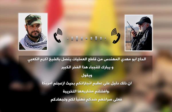 در همین حین، «ابو مهدی المهندس» جانشین رئیس سازمان بسیج مردمی (الحشد الشعبی)، در تماسی تلفنی با «شیخ اکرم الکعبی» دبیرکل مقاومت اسلامی نُجَباء، از فعالیت‌های این گروه مقاومت تقدیر و پیروزی‌های نُجَباء در مقابل توطئه‌های آمریکایی را تبریک گفت.