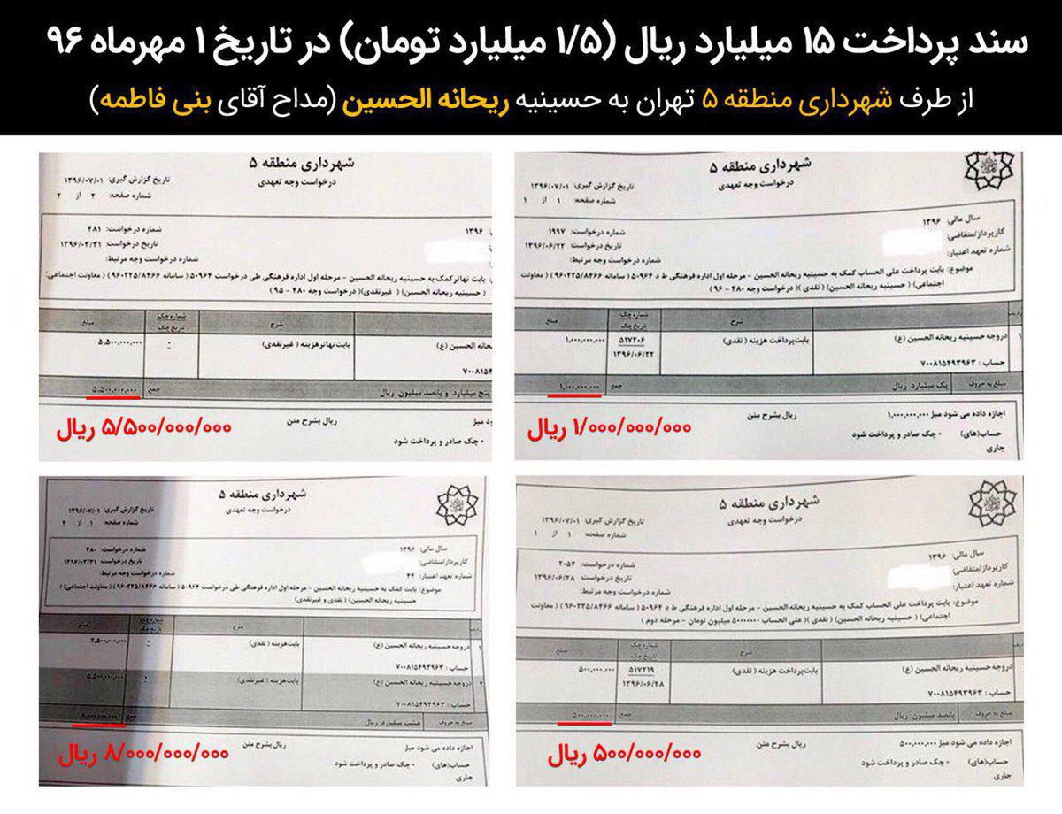برای مثال شهرداری منطقه ۵ در مهرماه امسال ۱/۵میلیارد تومان به حسینیه #ریحانه_الحسین (مداح آقای بنیفاطمه) پرداخت کرده است.»
