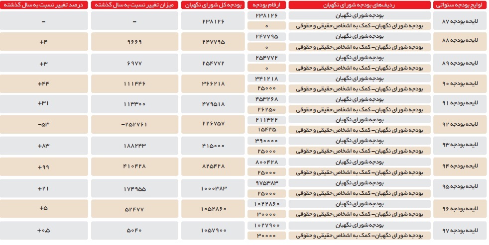 به گزارش جماران، روزنامه شرق نوشت: بودجه شورای نگهبان از ٢٣ میلیارد و ٨١٢٦ میلیون در لایحه بودجه سال ٨٧، به ١٠٥ میلیارد و ٧٩٠٠ میلیون در لایحه بودجه سال ٩٧ رسیده است. این اعداد گویای آن است که بودجه شورای نگهبان در یک دهه اخیر ۴.۵ برابر شده است. شورای نگهبان یک ردیف بودجه مشخص و ثابت در لوایح بودجه سنواتی دارد؛ ردیف ١٠١٦٠٠.