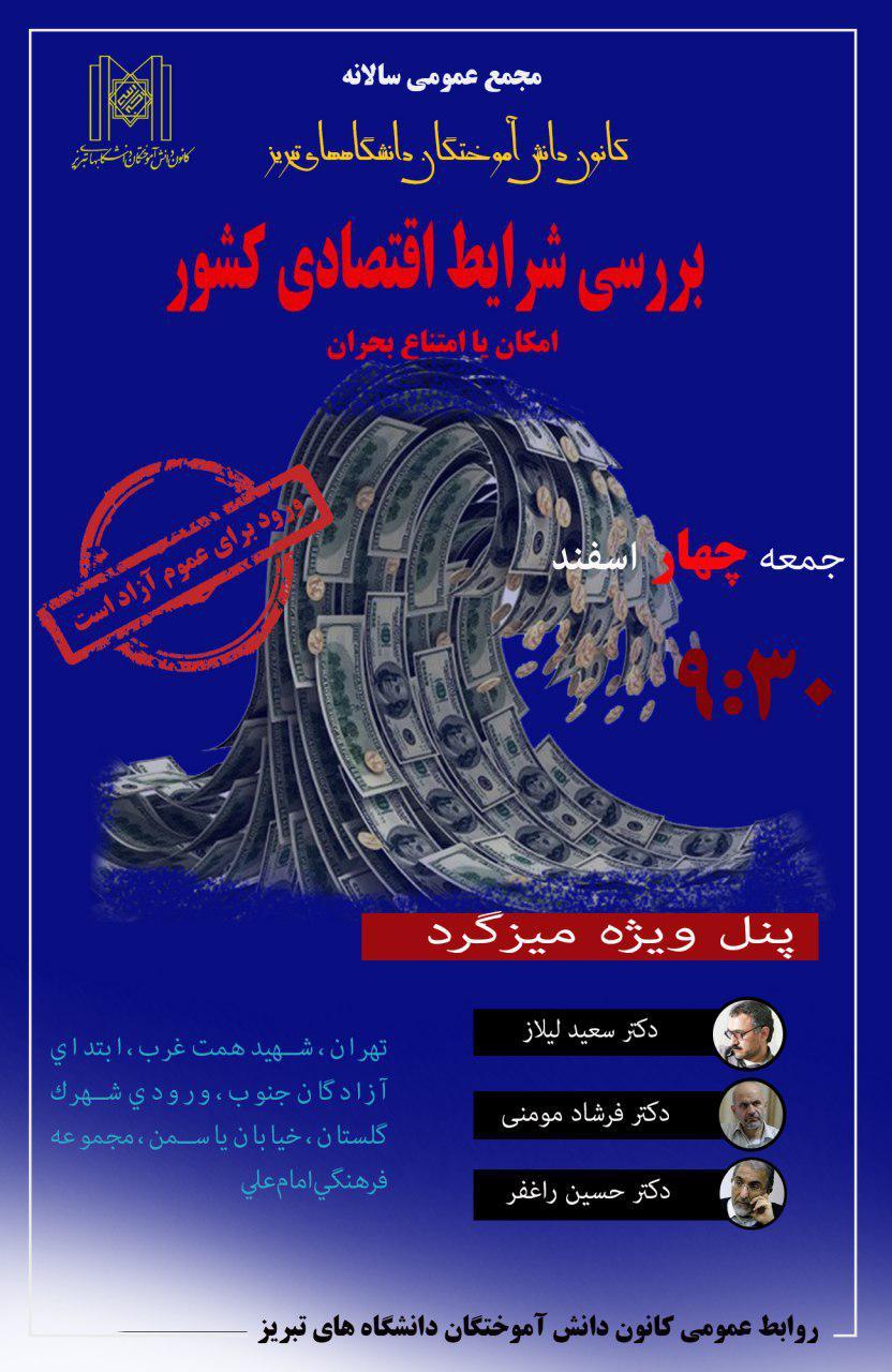 به گزارش روابط عمومی کانون دانشآموختگان دانشگاههای تبریز، پنل ویژهای در نظر گرفته شده است که با حضور اساتید صاحب نظر اقتصادی کشور به بررسی شرایط اقتصادی موجود در کشور خواهد پرداخت.