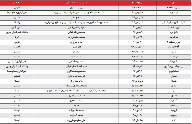 ١٧ بهمن سال ٩٥ پایگاه اطلاعرسانی آستاننیوز افتتاح دفاتر نمایندگی آستان قدس را راهبردی جدید برای خدماترسانی به محرومان توصیف کرد.