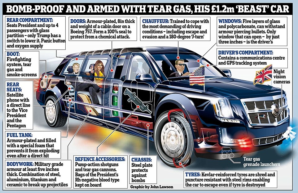 خودروی موسوم به The Beast لیموزین 7 صندلی با نهایت حمایت نظامی از رئیسجمهوری آمریکا ساختهشده که در کنار 17 خودروی دیگر و سایر ادوات نظامی و غیرنظامی بهاندازه یک زمین فوتبال، او را در سفرهای خارج پشتیبانی میکند.