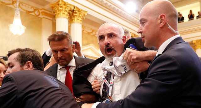 نیروهای امنیتی یک خبرنگار را دقایقی پیش از آغاز کنفرانس مطبوعاتی دونالد ترامپ و ولادیمیر پوتین، از محل برگزاری این کنفرانس بیرون بردند.