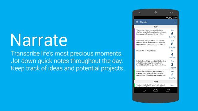 از جمله این اپلیکیشنهای جدید، Narrate را میتوان نام برد. این برنامه به کاربران امکان یادداشت متنها مختلف را داده و همچنین یک تقویم کامل را نیز در اختیار آنها قرار میدهد. همچنین امکان اتصال برنامه به سیستمهایی همچون دراپباکس و Day One نیز وجود دارد؛ البته در نسخهی غیر رایگان برنامه. برنامه امکان دیکته کردن کلی متن و یا تایپ آن را به کاربران میدهد. تاریخ نوشته شدن مطالب به صورت خودکار بر روی آنان قرا میگیرند، ضمن اینکه امکان قرار دادن تگهای مورد نظرتان در آینده نیز وجود دارد.