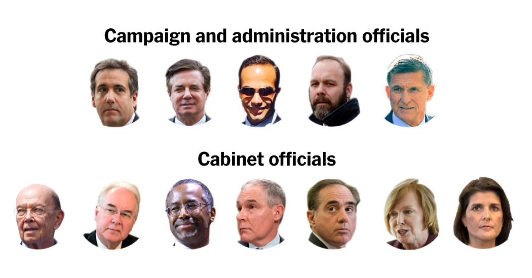 به گزارش پایگاه اطلاع رسانی و خبری جماران، نیویورک تایمز در گزارش مصوری نوشت: از زمان برگزاری مراسم تحلیف «دونالد ترامپ»، مقامات متعددی در ستاد انتخاباتی کمپین و دولت وی به جرایم متعددی محکوم شده اند. شمار دیگری نیز به نقض قوانین اخلاقی فدرال متهم شده و یا مجبور به استعفای به دلیل برخی مسائل امنیتی شده اند. اتهامات جنایی همگی به فرایند تحقیقات «رابرت مولر» بازپرس ویژه، در مورد دخالت روسیه در انتخابات سال 2016 مرتبط است.