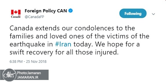 در این پیام آمده است: «کانادا مراتب تسلیت خود را به خانواده ها و عزیزان قربانیان زمین لرزه امروز #ایران ابراز می دارد. ما به بهبودی سریع زخمی ها را امید داریم.»