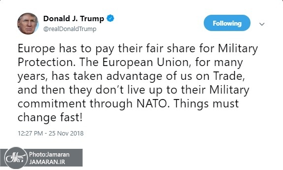 به گزارش پایگاه اطلاع رسانی و خبری جماران، روزنامه انگلیسی اکسپرس در گزارشی نوشت: «دونالد ترامپ» رئیس جمهور آمریکا در توییت جدید خود نوشت: «اروپا باید سهم عادلانه خود را در ازای حفاظت نظامی آمریکا بپردازد. اتحادیه اروپا طی سالها از آمریکا درباره تجارت سوء استفاده کرده است و همزمان به تعهدات نظامی خود در ناتو پایبند نبوده است. این شرایط باید به سرعت تغییر کند.»