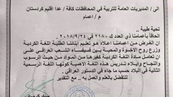 همچنین تأکید شده که وزارت آموزش و پرورش عراق، این تصمیم را بنا به قانون اساسی کشور که تصریح می کند، زبان کُردی زبان دوم رسمی کشور عراق است، اتخاذ کرده است.