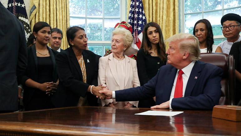 خانم مراد روز چهارشنبه به همراه جمعی از افرادی که قربانی آزار و شکنجه مذهبی شده اند پس از نشستی در وزارت خارجه آمریکا به دفتر دونالد ترامپ در کاخ سفید رفتند تا با رئیس جمهوری آمریکا ملاقات کنند.