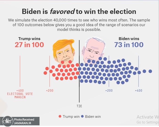 یک مرکز نظرسنجی انتخابات گزارش داد که شانس پیروزی جو بایدن در انتخابات ریاست جمهوری آمریکا 73 درصد نسبت به شانس 27 درصدی ترامپ است.