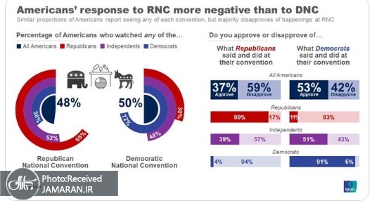 53 درصد از شرکت ‌کنندگان در این نظرسنجی گفتند برنامه ‌ها و پیام ‌های دموکرات ‌ها را تایید می ‌کنند، در حالی که 37 درصد از شرکت ‌کنندگان همین نظر را در رابطه با جمهوری ‌خواهان داشتند. به طور کلی 59 درصد از شرکت ‌کنندگان در این نظرسنجی گفتند که این کنوانسیون را تایید نمی‌ کنند.