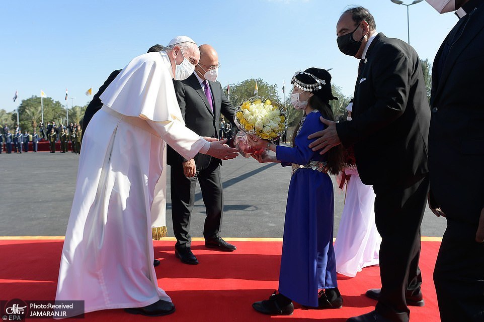 رهبر کاتولیک های جهان با گذشتن بیش از یک سال محدودیت های کرونایی برای یک سفر 3 روزه جمعه در میان تدابیر شدید امنیتی و مقررات منع ورود به بغداد، وارد عراق شد. سفر پاپ به عراق همزمان شده با تدابیر منع تردد سه روزه که در طول مدت اقامت پاپ در عراق برقرار است و همزمان دولت عراق تدابیر گسترده امنیتی برای این سفر تدارک دیده است.