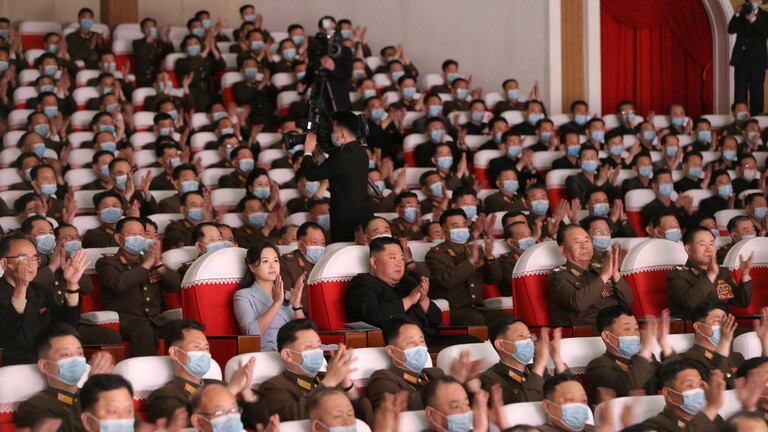 تصاویر منتشر نشان می دهد که همه حاضران در تالار نمایش ماسک زده بودند به جز کیم و همسرش و مسئولان بلندپایه این کشور.