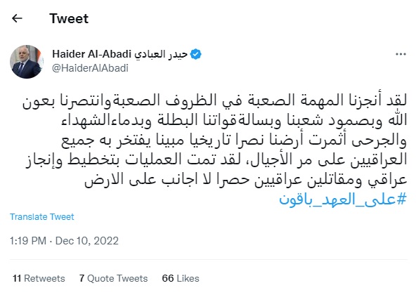حیدر العبادی در صفحه شخصی اش در توییتر نوشت آزادسازی عراق از چنگ داعش تنها توسط عراقیها انجام شد.