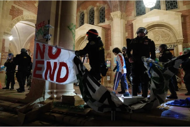در همین حال، صدها نیروی پلیس به منظور آمادگی برای تخلیه معترضان حامی فلسطین که شب قبل مورد حمله طرفداران رژیم اسرائیل قرار گرفتند، در محوطه دانشگاه کالیفرنیا در لس آنجلس مستقر شده اند.