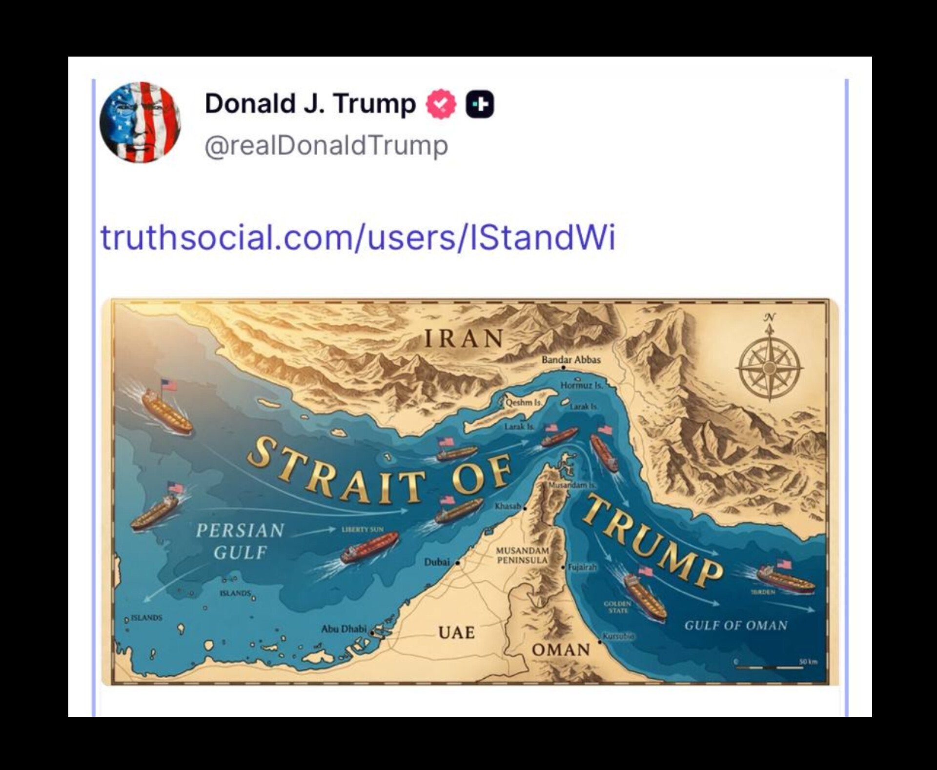 به گزارش سرویس بین الملل جماران، دونالد ترامپ چهارشنبهشب در شبکه اجتماعی «تروث سوشال» تصویری از خلیج فارس، تنگه هرمز و دریای عمان را بازنشر کرد که در آن عبارت جعلی «تنگه ترامپ» درج شده بود؛ هرچند در همان تصویر نام خلیج فارس و دریای عمان نیز ذکر شده است.