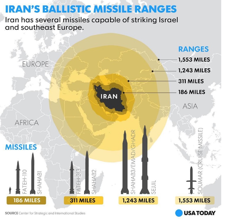 ایران موشک هایی در اختیار دارد که برد آنها به سرزمین های اشغالی و جنوب شرق اروپا می رسد: فاتح 110 و شهاب1: 186 مایل؛ فاتح 313 و شهاب2: 311 مایل؛ شهاب3/عماد/قدر و سجیل: 1،243 مایل؛ موشک های کروز: 1،553 مایل.