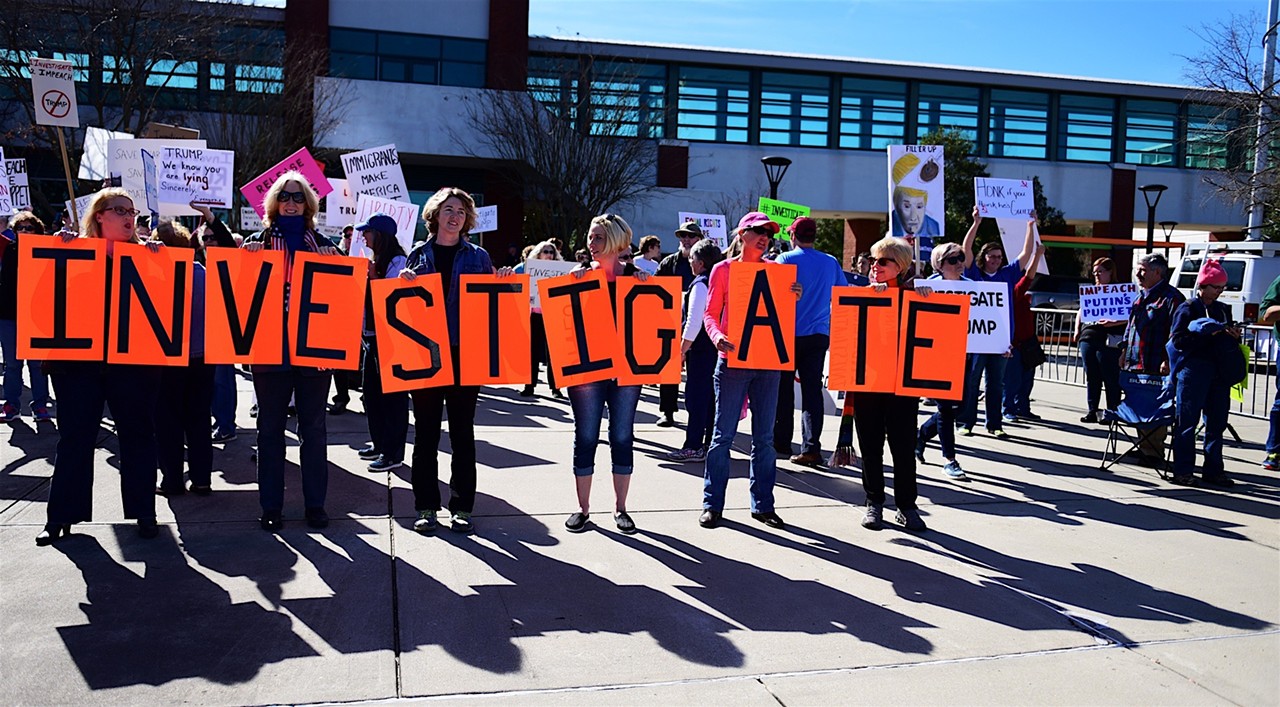 به گزارش پایگاه اطلاع رسانی و خبری جماران به نقل از روزنامه چارلستون سیتی، تظاهرات کنندگان در حالی که شعار می دادند «استیضاح! استیضاح!»، خواستار انجام تحقیقات مستقل در مورد روابط دولت ترامپ با روسیه شدند.