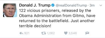 در این توییت آمده است: «122 زندانی شرور که از سوی دولت باراک اوباما از بازداشتگاه گوانتانامو آزاد شده بودند ، به میدان نبرد بازگشته اند.»