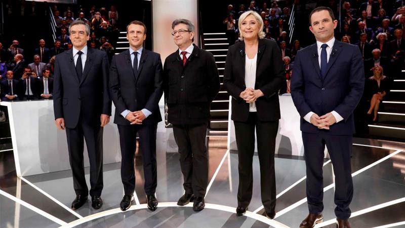 «ژان لوک ملانشون» که از سوی کمونیست ها حمایت می شود، یک انقلابی است که می خواهد فرانسه را به روسیه نزدیک کند. «بنوا آمون» سوسیالیست، سیاستمداری جوان - تقریبا ساده و بی تکلف - با رویاهای آرمانی برای ارائه حداقل درآمد برای همه بدون درخواست برای کاری در ازای آن است. «امانوئل ماکرون» میانه رو نیز تقریبا با همه موافق است. فرانسوا فیون به عنوان یک جمهوری خواه طرفدار بازار نیز می خواهد با طرح های خود در بخش خدمات شهری جیب ثروتمندان را پر کند و از خودش شروع می کند. در نهایت لوپن از جناح راست افراطی استدلال های بیگانه هراسی را مطرح می کند و با الگو قرار دادن دونالد ترامپ و ولادیمیر پوتین آرزوی فرگزیت (خروج فرانسه از اتحادیه اروپا را در سر می پروراند).