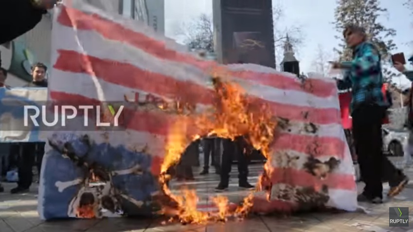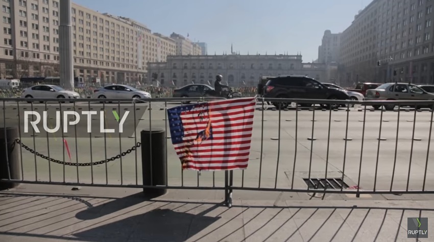 شماری از شهروندان عضو «سازمان های ملی حقوق بشری و اجتماعی» و «کمیته مردم بولیواری ونزوئلا» در خیابان های «سانتیاگو» پایتخت شیلی تجمع کرده و در اعتراض به سفر مایک پنس پرچم آمریکا را به آتش کشیدند.