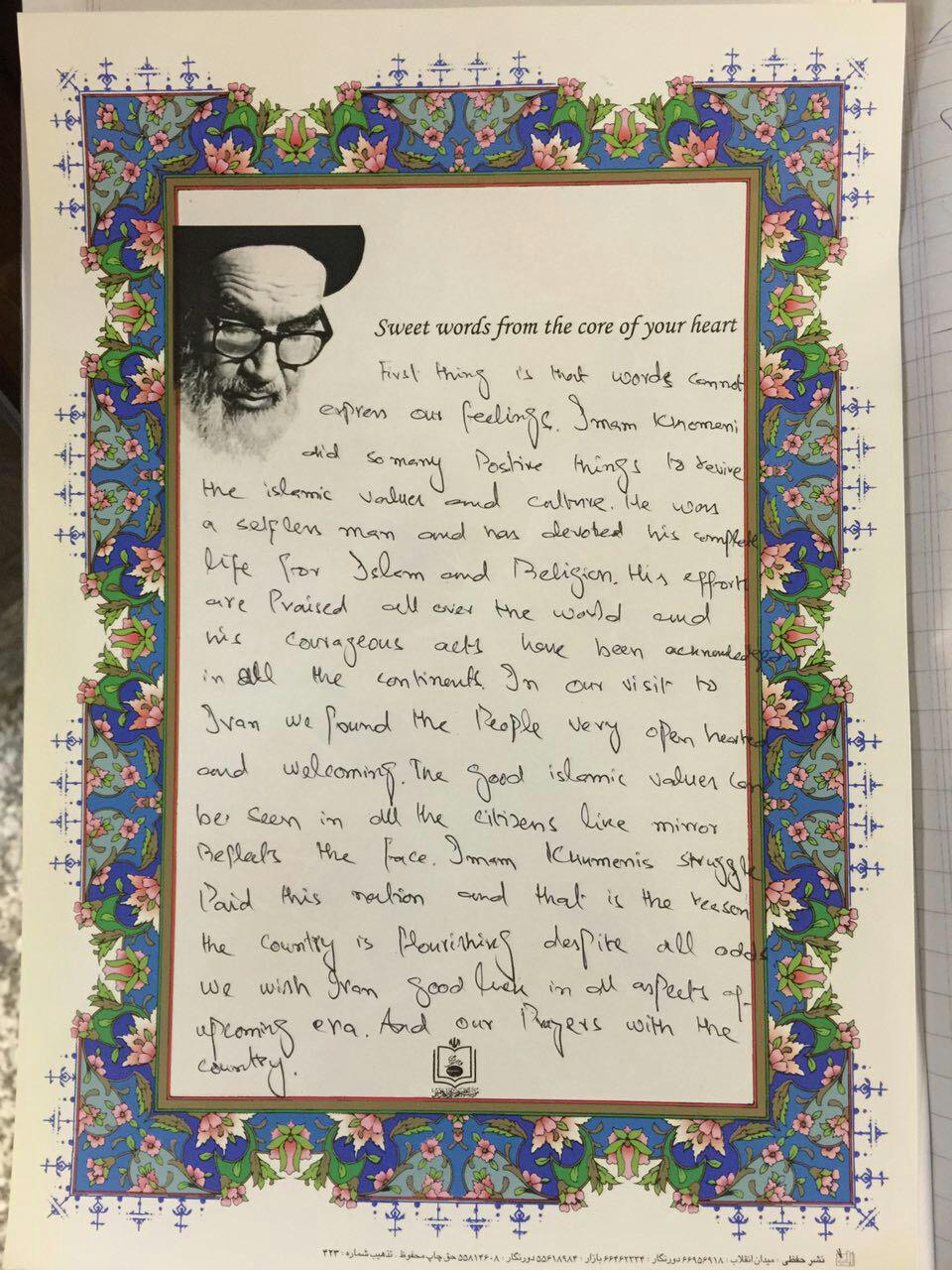 در ادامه این دست نوشته آمده است: «امام خمینی از ایران در برابر هجمه ها دفاع کرد و به همین دلیل است که این کشور به رغم تمامی موانع، در حال توسعه است.»