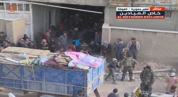 غیرنظامیان از شهرک های حموریه، «کفربطنا»،«سبقا» و «جسرین»که از پایگاه های گروه فیلق الرحمن در منطقه جنوبی غوطه در حال خارج شدن و رفتن به منطقه امنی هستند که ارتش سوریه ایجاد کرده است.