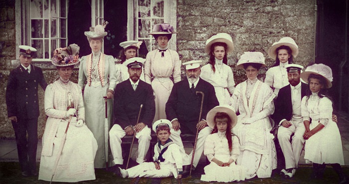 نیکلای دوم همراه با خاندان سلطنتی بریتانیا شامل، شاه ادوارد هفتم (وسط تصویر) و جورج پنجم(نشسته سمت راست). سال ۱۹۰۹