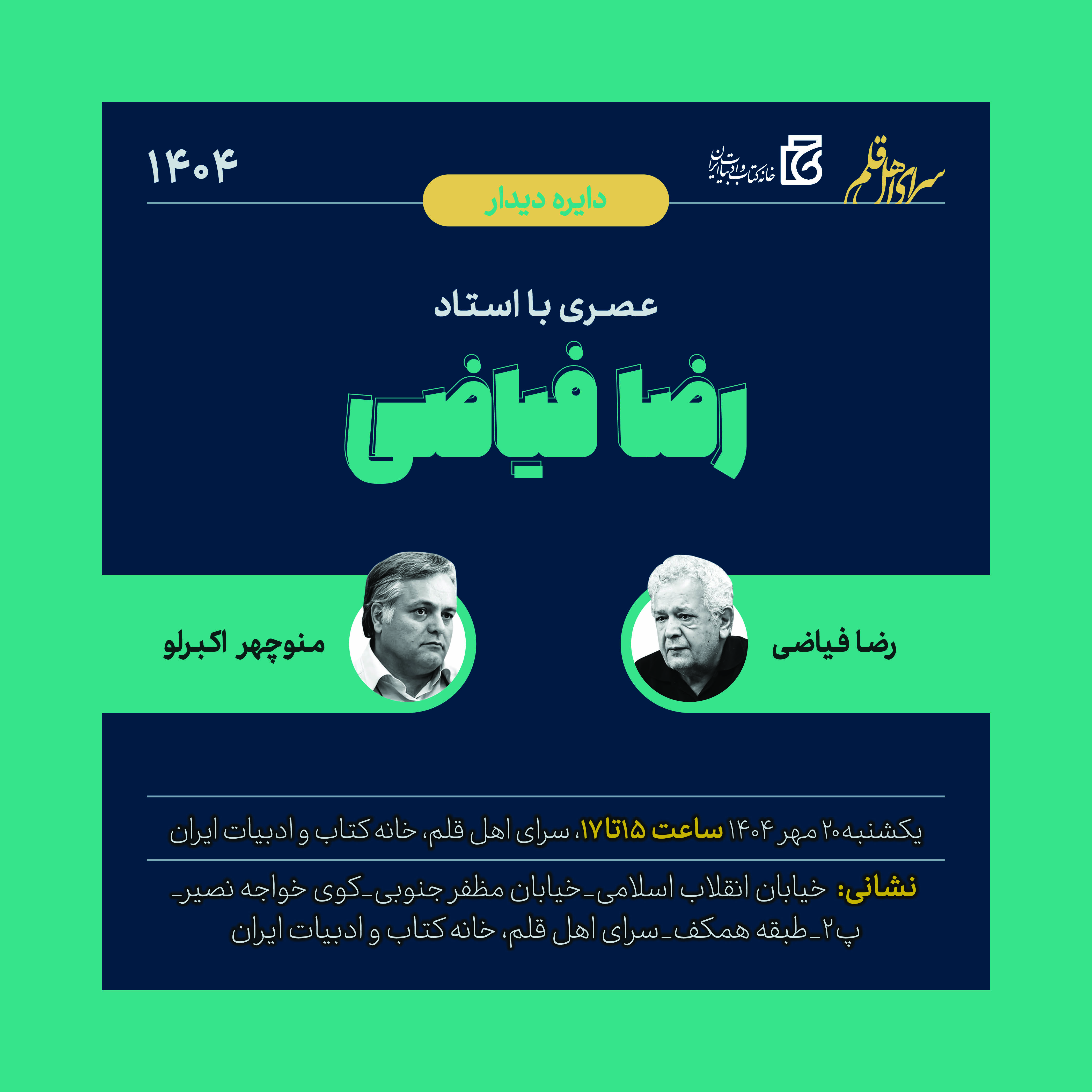 نشست «عصری با استاد رضا فیاضی» فردا یکشنبه بیستم مهر (۱۴۰۴) در خانه کتاب و ادبیات ایران برگزار میشود.