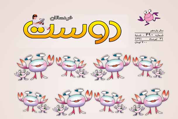 روی جلد هر شماره از دوست خردسال تصویر شیء یا موجود زنده ای مثل صندلی، شترمرغ، گردو ، اتو ، جوجه و ...ترسیم شده است که در صفحه اول در مورد خودش و کاربردش برای خردسالان صحبت کرده و بچهها را دعوت میکند که برای دیدن مجله همراهش بیایند. این شماره تصویری از یک خرچنگ را روی جلد خود دارد که پس از معرفی خود خردسالان را به خواندن مجله دعوت میکند.