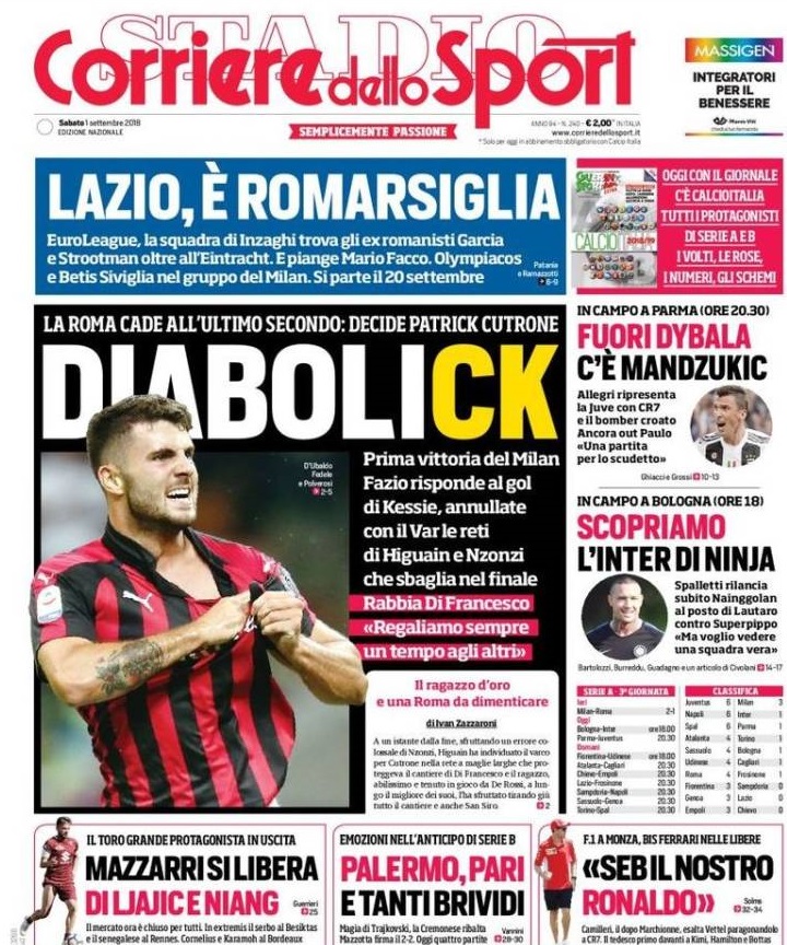 جلد روزنامه کوریره دلو اسپورت خبر داد که پائولو دیبالا در بازی مقابل پارما غایب خواهد بود اما ماریو مانژوکیچ در ترکیب اصلی یووه در این بازی حضور خواهد داشت.