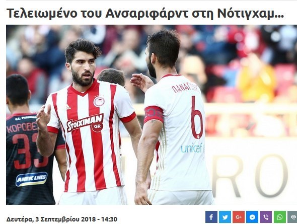 رسانه خبری باشگاه المپیاکوس یونان در ادامه با اشاره به آغاز روند انتقال کریم انصاری‌فرد به تیم ناتینگهام فارست نوشت: ابتدا رسانه‌های انگلیسی پس از پایان بازی تیم المپیاکوس در دور برگشت مرحله چهارم حذفی لیگ اروپا برابر برنلی از عدم بازگشت انصاری‌فرد به یونان جهت انجام مقدمات انتقالش به تیم ناتینگهام فارست خبر داده بودند. از سویی ملی‌پوش ایرانی همراه کاروان تیم المپیاکوس از انگلیس به یونان بازگشت و به خاطر عدم واکنش باشگاه انگلیسی تردیدهایی در این انتقال به وجود آمدند.