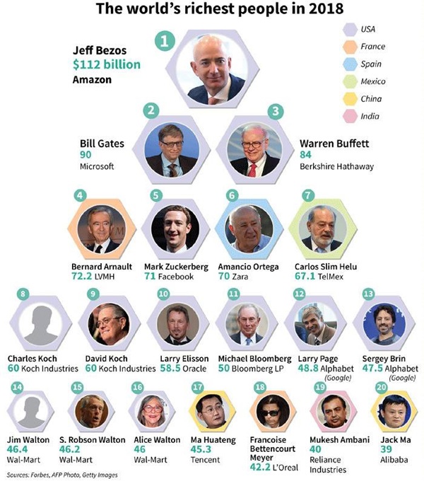 گزارش مجله تخصصی Forbes نشان میدهد که آمریکاییها در این عرصه پیشتاز هستند و 585 میلیاردر در این کشور زندگی میکنند و چین هم با داشتن 373 میلیاردر، در رده دوم ثروتمندترین کشورهای جهان قرار دارد. جف بزوس با سرمایه صد میلیاردی خود موفق شده است برای اولین در صدر لیست ثروتمندترین مردان جهان قرار گیرد و فاصله زیادی را نسبت به رقبای خود ایجاد کند. وی برای اولین بار در تاریخ است که در لیست Forbes موفق شده سرمایه خود را به دوازده رقم برساند. بزوس سال گذشته حدود 39 میلیارد دلار سود کرده است که بیشترین میزان سود در یک سال را در کل تاریخ نشان میدهد. جف بزوس موفق شده است فاصله خود را با میزان سرمایهای که به دست آورده از بیل گیتس در رده دوم ثروتمندترین افراد جهان بیشتر کند. بیل گیتس که از سال 2001 همیشه در رتبههای اول و دوم قرار گرفته است، حالا بیشترین فاصله را با روزهای گذشته خود دارد. مهمتر اینکه، نفر چهارم لیستی که Forbes اعلام کرده، برنارد آرنالت با سرمایه 72 میلیارد دلاری است که با این سرمایه موفق شده است از سال 2012 عنوان ثروتمندترین فرد اروپا را هم به خود اختصاص دهد.