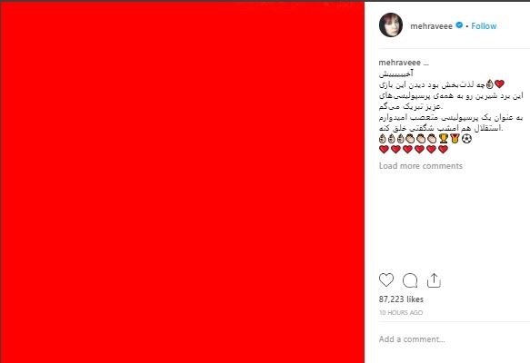 به گزارش جی پلاس، مهراوه شریفی‌نیا یکی از پست‌های اینستاگرامش را به تصویری کاملا قرمز اختصاص داد و نوشت: «چه لذت‌بخش بود دیدن این بازی. این برد شیرین رو به همه‌ی پرسپولیسی‌های عزیز تبریک می‌گم. به عنوان یک پرسپولیسی متعصب امیدوارم استقلال هم امشب شگفتی خلق کنه.»