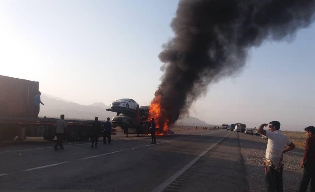 تریلی حامل خودروهای لوکس که از محور بندرعباس به لار در حرکت بود دچار آتش سوزی شد.