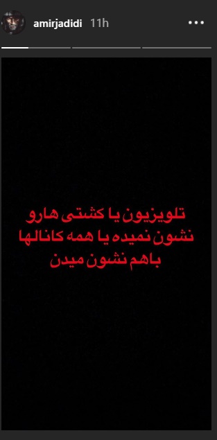 به گزارش جی پلاس، امیر جدیدی در واکنش به سیاست تلویزیون برای پخش مسابقات جام جهانی کشتی آزاد در بوداپست، در اینستاگرام نوشت: «تلویزیون یا کشتی ها رو نشون نمیده، یا همه کانال ها باهم نشون میدن.»