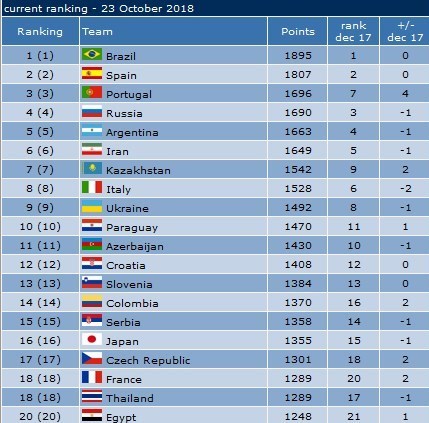 تیمهای ملی فوتسال برزیل، اسپانیا، پرتغال، روسیه و آرژانتین در رتبههای اول تا پنجم ردهبندی جای دارند.